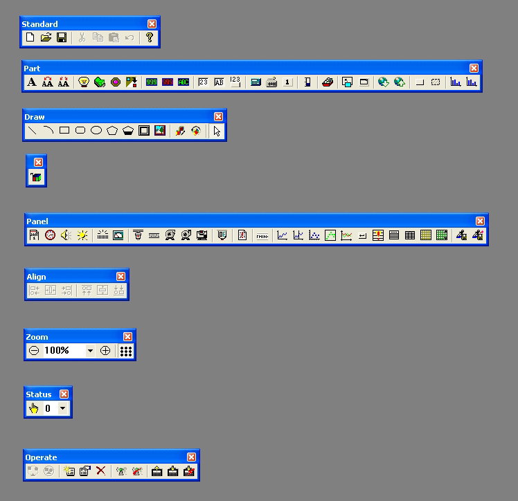 Many objects have a property called Aspect. This is the representation as a standard object. You can use Change to select from a gallery to change the display. TouchWin has very extensive galleries of graphic templates. Sometimes you will have to adjust the size of the object so that it fits the new display. Some objects allow you to freely design the display using your own bitmaps.