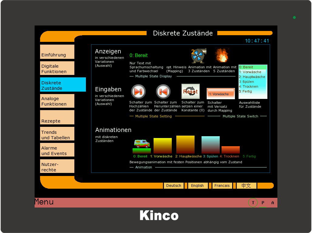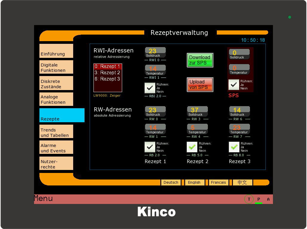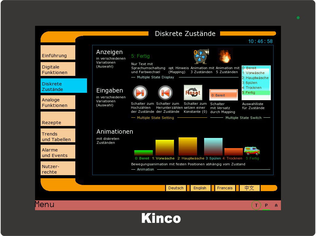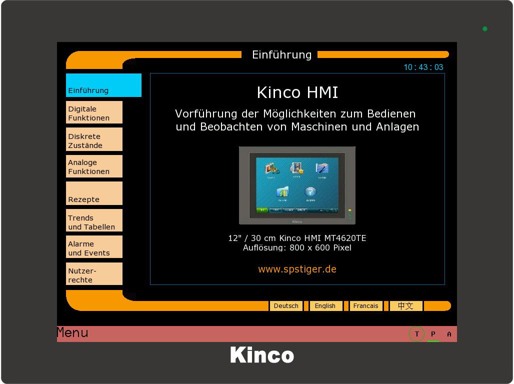 Wir haben für die HMI von Kinco eine sehr umfassende Demo erstellt. Im Demoprojekt sind die wichtigsten Funktionen und Möglichkeiten des HMI aufgezeigt. Ihr könnt die Demo hier völlig frei herunterladen und nach Herzenslust ausprobieren und natürlich auch ändern. Nutzt dazu einfach den Simulationsmodus der Kinco HMI Software. Zum Ausführen der Demo ist die aktuelle Version 2.0 von Kinco HMIware erforderlich. Im Beispielprojekt gehen wir neben grundlegenden Funktionen wie Schalter, Zustandsanzeigen und Analogwerten auch auf Rezeptverwaltung, Trends, Alarmierung und Rechteverwaltung ein. Für Rückfragen und Anregungen stehen wir jederzeit zur Verfügung.